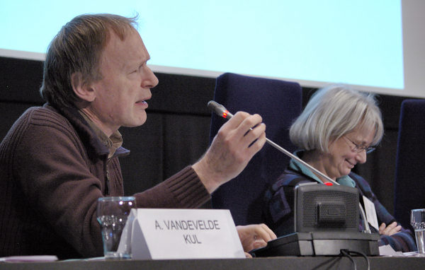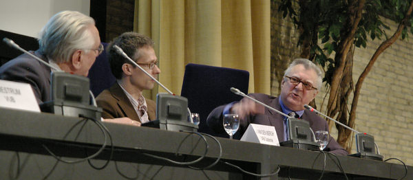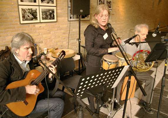 Bij de foto’s: 1. ‘Het debat der economen’ 2. Antoon Vandevelde en Francine Mestrum 3. Pequeno verzorgde gedurende de pauzes de muziek.